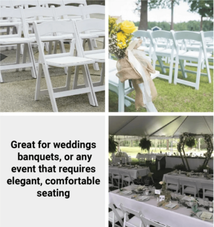 Upgrade your event seating in Grand Rapids with our White Garden Chairs, a stylish and durable alternative to traditional plastic folding chairs. Made from 100% non-recycled virgin resin, these chairs are built to resist splintering, warping, and fading, making them a reliable choice for weddings, banquets, graduations, and other upscale gatherings. Unlike standard wood chairs that can wear down over time, our resin chairs help reduce maintenance and replacement costs while offering a sleek, elegant look that doesn't require chair covers, saving both time and effort. With a sturdy design supporting up to 350 lbs of dynamic weight and 1,000 lbs of static weight, these chairs are perfect for event rental businesses, venues, and anyone in need of high-quality, comfortable seating for everything from intimate celebrations to large-scale events.