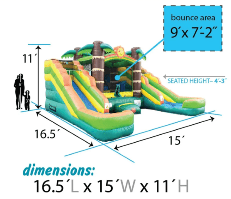 Introducing our Jungle Bounce House with 2 Water Slides—an exciting jungle-themed adventure right in your own backyard! This inflatable wonderland brings the thrill of the wild with two thrilling water slides, promising endless hours of splashing fun. Crafted with sturdy materials and advanced safety features, parents can relax while kids bounce and slide in jungle style. Let their imaginations roam free and create unforgettable jungle adventures with our Jungle Bounce House!