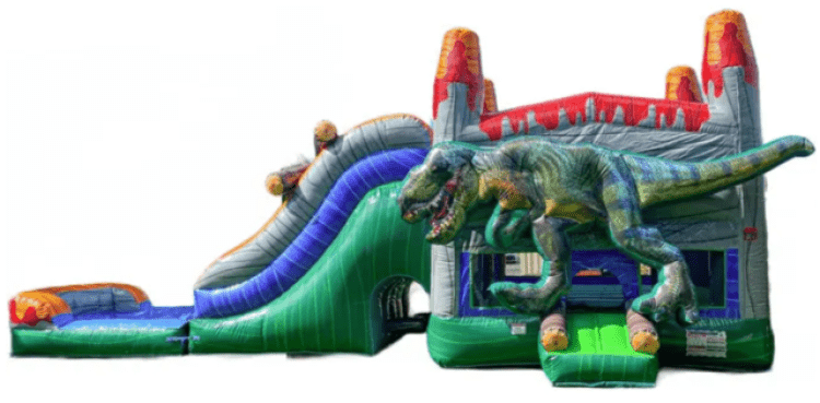 Introducing our T-Rex Bounce House with Water Slide – a roaring adventure for kids and adults! This combo bounce house features a thrilling water slide with a platform height of 8ft, providing a dynamic and refreshing play area. In addition to the excitement of the slide, the bounce house includes a basketball hoop for some friendly dunking fun and a tunnel under the slide for adventurous kids to climb through. The T-Rex design adds a prehistoric touch, making it an ideal choice for birthday parties, family gatherings, or any outdoor celebration. Kids can bounce, climb, slide, and explore, ensuring hours of lively entertainment. With its versatile features and dino-themed design, our T-Rex Bounce House with Water Slide promises a fantastic and memorable experience for all attendees!